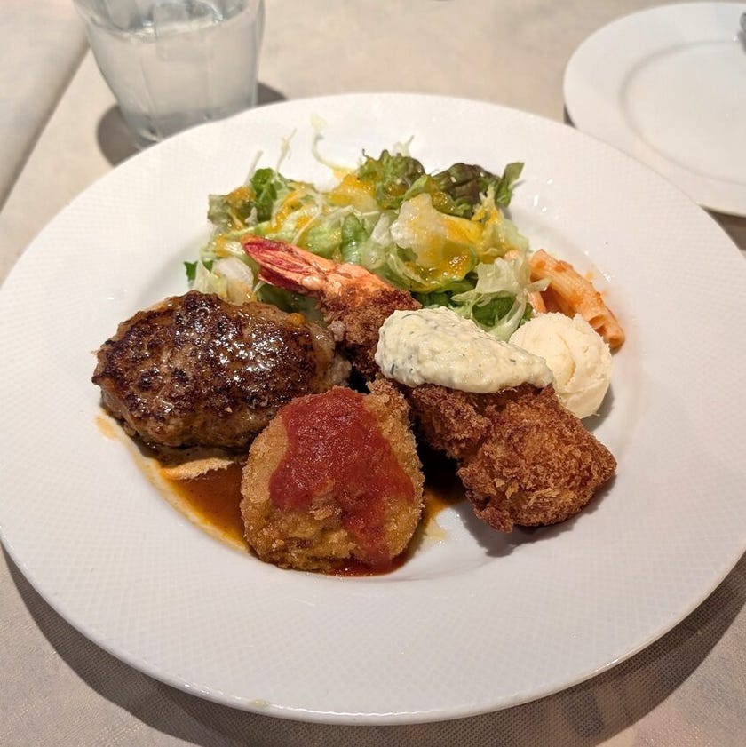 その後メインの料理が到着。エビフライが分厚くてプリプリ(≧▽≦)ハンバーグも柔らかくて、カニクリームコロッケもクリーミーで美味しかったです。