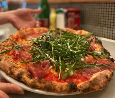 個人的にイチオシピザは写真の「プローヴォラ・マルゲリータ・コンプロシュット・エルコラ」(名前長っ!注文するときは指差しオーダーです)生地がほんとにモチモチで大量のルッコラと生ハムとの相性がバツグンです!